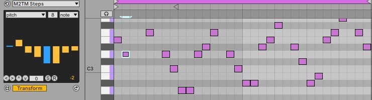 M2TM Steps is a MIDI Tool for Ableton Live 12, that allows you to alter note attributes - pitch, velocity, start time, duration, chance, mute, velocity deviation and release velocity - in a cyclic fashion. By creating cycles of these attributes you can easily create melodic and accent patterns, randomize melodies and a lot more, in seconds and with very little effort.